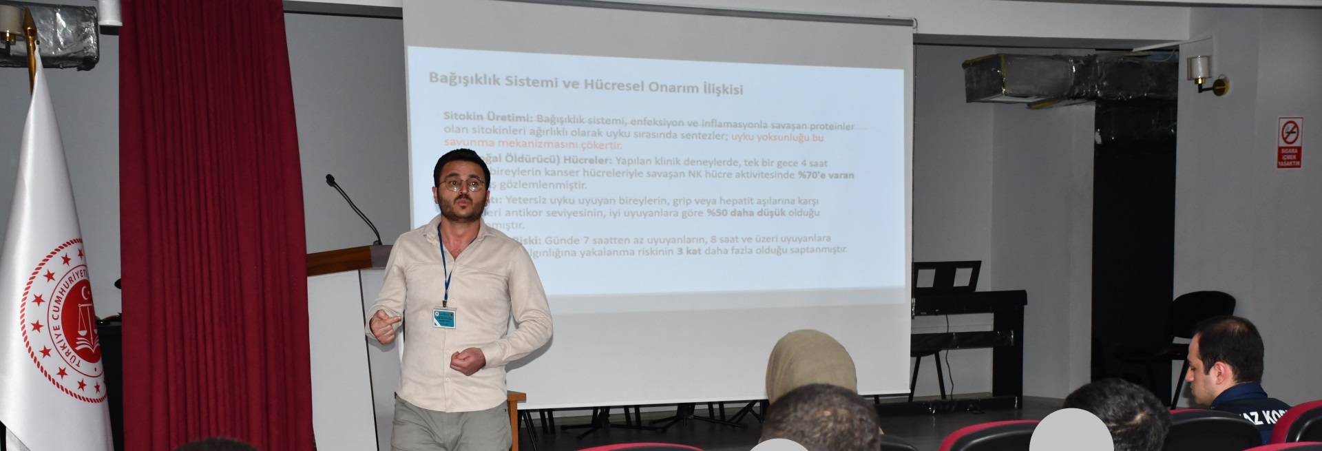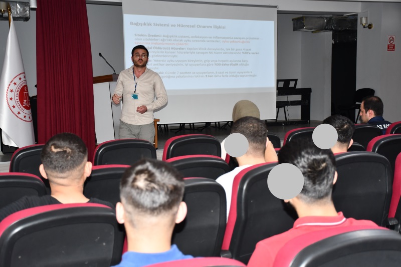Kurumumuzda 16.04.2026 günü, saat 14:00’te Adana İl Sağlık Müdürlüğünce görevlendirilen Sosyal Çalışmacı Erhan Taneri tarafından ‘Uyku Düzeni ve Uyku Hijyeni’ konulu konferans gerçekleştirilmiştir. Düzenlenen programda, uyku düzeninin bireylerin fiziksel ve ruh sağlığı üzerindeki belirleyici rolü ele alınmış; sağlıklı ve kaliteli uyku için gerekli olan temel davranış ve alışkanlıklara ilişkin kapsamlı bilgilendirme yapılmıştır. Konferans kapsamında düzenli uyku alışkanlığı kazanmanın önemi, uyku öncesi ekran kullanımının sınırlandırılması, uygun uyku ortamının oluşturulması ve stres yönetiminin uyku kalitesi üzerindeki etkileri bilimsel çerçevede değerlendirilmiştir. Katılımcıların günlük yaşamlarına uyarlayabilecekleri uygulamaya dönük öneriler sunularak farkındalık düzeylerinin artırılması hedeflenmiştir.