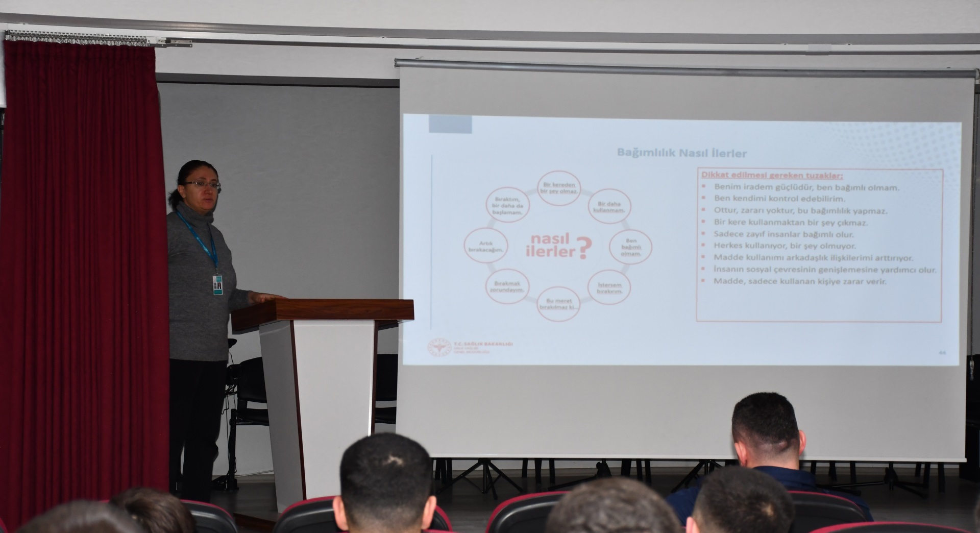 Adana İl Sağlık Müdürlüğü tarafından kurumumuzda konferans vermek üzere görevlendirilmiş olan Dr. Yasemin Akdoğan tütün bağımlılığı ve madde bağımlılığı ile mücadele konulu konferans vermiştir. Konferans hükümlü tutukluların etkin katılımı ile gerçekleşmiştir. Program sonunda hükümlü tutukluların bağımlılıkla ilgili soruları alınmış ve gerekli açıklamalar yapıldıktan sonra program sona ermiştir.